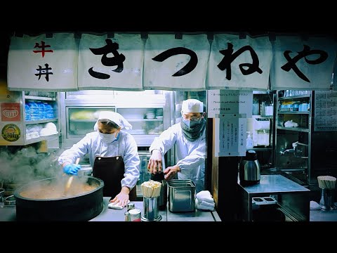 【わずか25秒の神速提供!築地の大行列立ち食いホルモン丼・牛丼「きつねや」の仕込みと朝のラッシュに密着!】 Standing horumon beef bowl 築地大遊行站立吃荷爾蒙碗 소내장덮밥